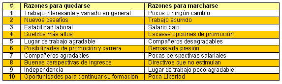 Dar por supuesto estos aspectos, puede dar a lugar a descuidar otras cuestiones, que en su conjunto, pueden tener más relevancia que sólo la cuestión económica, como el reflejado en el siguiente cuadro, de hace algunos años, pero que no ha perdido vigencia (“Razones para el movimiento de personas en el sector de las Tecnologías de la Información en los Países Bajos”)