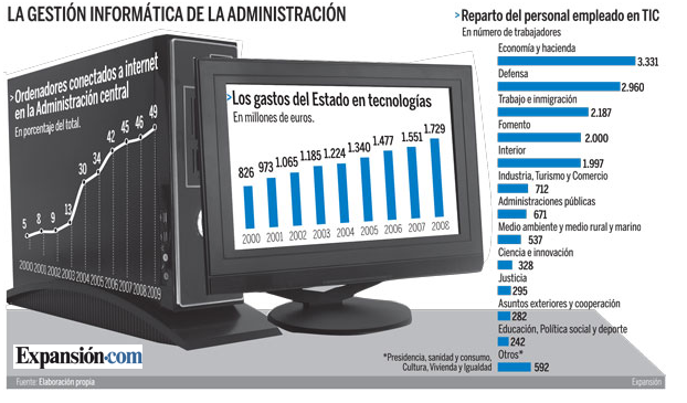 - Gastos en TIC en 2008:1.729, 13% más que el año anterior y 3.6% del gasto total.