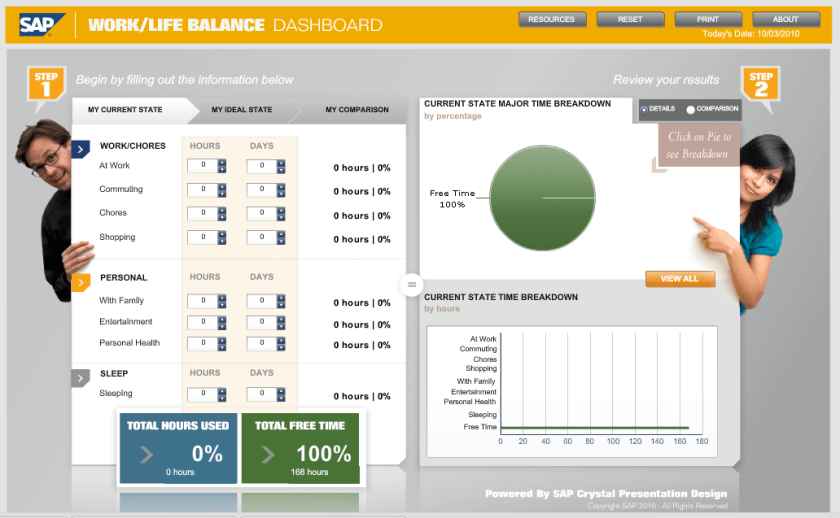 SAP, para mostrar las ventajas y usos que puede tener una herramienta como Xcelsius (SAP Crystal Dashboard Design) ha desarrollado una interesante tabla de indicadores que permite analizar el tiempo dedicado al trabajo y la vida personal o privada.