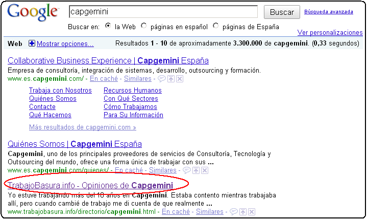 Casi no hay empresa consultora que al buscarla a través de Google, en la primera página de resultados, además de la información corporativa, figura algún enlace a una página Web donde ex trabajadores, con o sin fundamento, comentan las experiencias negativas que han tenido con la empresa.