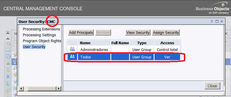 Imagen anterior Opción por defecto, el Grupo Everyone con acceso a la Consola de Administración Central (CMC) de SAP BusinessObjects