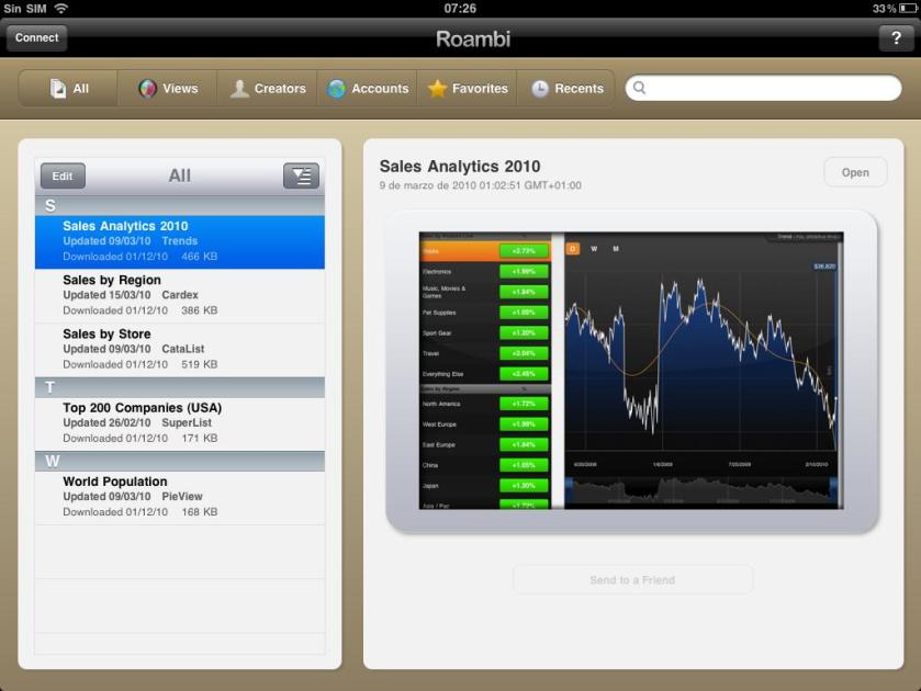 Nos gusta Roambi por la calidad de sus gráficos y el diseño de sus pantallas, bien organizadas, aprovechando muy bien el espacio disponible que ofrece el iPad.