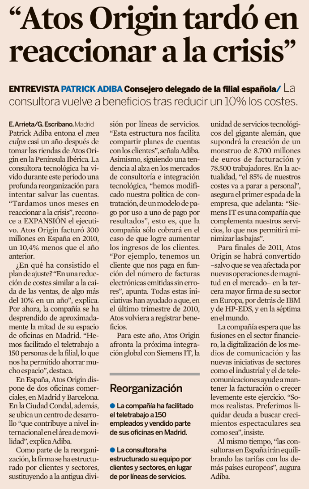 Lecciones de ajuste de Atos Origin España – Entrevista al Consejero delegado de la filial, Patrick Adiba – Diario Expansión del 30 de marzo 2011