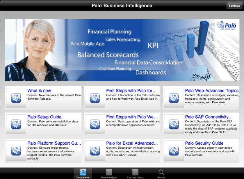 Una de estas aplicaciones es de Jedox (aquí enlace en iTunes), fabricante Open Source, que tiene como principal producto a PALO, una aplicación de reporting y de planificación muy fácil de utilizar, alguna vez hemos escrito sobre este producto (aquí).