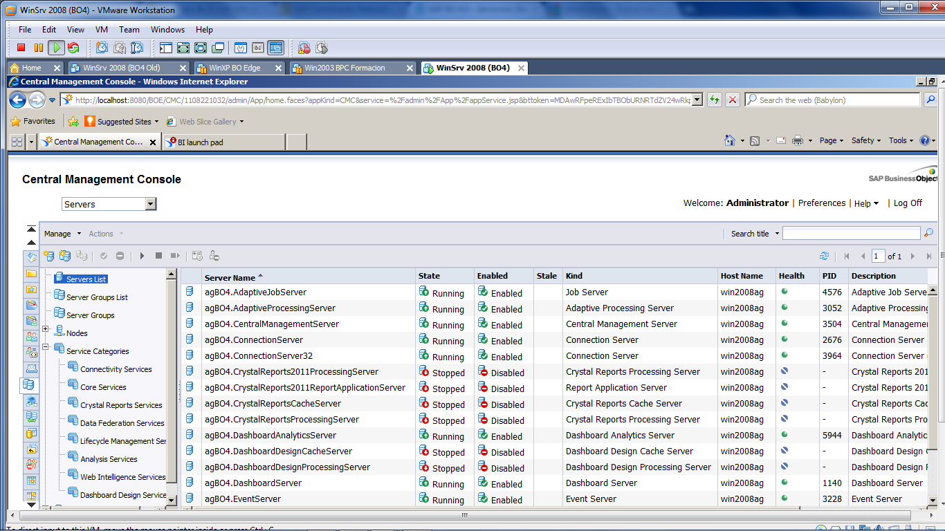 Imagen anterior Imagen siguiente SAP BO 4.0 – Servicios (Servidores BO) que hemos deshabilitado, temporalmente, en el CMC para evitar la ralentización del sistema operativo