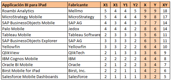 El resultado de la anterior valoración nos permite graficar nuestro Cuadrante de Apps BI Mobile for iPad: