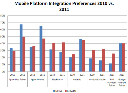 Otro aspecto importante es lo referido a las plataformas móviles elegidas, es cosa de dos, nos referimos a dispositivos Apple y Android, son los dispositivos que muestran un claro crecimiento, todo lo contrario sucede con los dispositivos Blackberry y basados en Windows Mobile.
