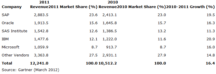 Worldwide BI, Analytics and Performance Management Revenue Estimates for 2011 (Millions of U.S. Dollars)