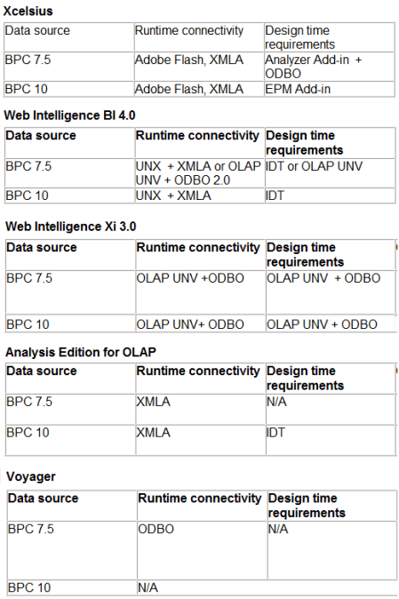 Complementando lo que comentábamos en un post anterior, presentamos las siguientes tablas que hemos extraído de la nota técnica 1731626, la cual detalla las posibilidades de conectividad SAP BsinessObjects BI con SAP Business Planning and Consolidation (SAP BPC).
