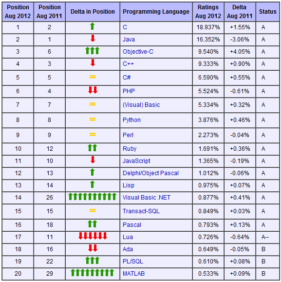 TIOBE Programming Community Index for August 2012 – Este índice no incluye VBA, pero si Visual Basic, así como tampoco incluye SQL pero si los lenguajes o extensiones basados en el como PL-SQL