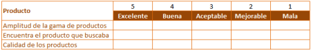 De todas las preocupaciones del cliente, sólo el “cumplimiento de los plazos” puede medirse con objetividad, podría pensarse que quizás la “amplia gama de productos” también podría ser medido directamente, pero en este caso lo que se desea medir es la percepción que tiene el cliente, para este tema, así como para los demás inquietudes del cliente, el mejor sistema de valoración son las encuestas, las cuales deben ser breves y fácilmente ponderables.