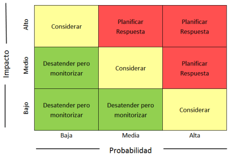 Las respuestas obtenidas se podrían ubicar dentro de una matriz 3 x3 para analizar el impacto vs. Probabilidad de cada riesgo. En la matriz propuesta se estiman tres niveles (bajo, medio y alto), pero dependiendo de las características del proyecto, quizás sería necesario ampliar el número de respuestas (por ejemplo: bajo, medio bajo, medio, medio alto, alto). Los riesgos identificados con alta probabilidad y alto impacto deberán tener un tratamiento especial y el equipo de proyecto debe estar preparado para brindar una respuesta inmediata si estos se concretaran.
