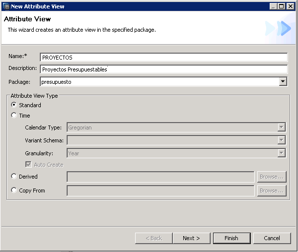 Ventana inicial de definición de un Attibute View