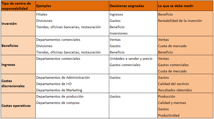 Lo que se debe medir o controla segun los tipos de centros de responsabilidad