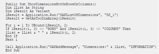 Imagen anterior Muestra VBA con métodos API de Analysis for Office. Las dimensiones que no estén en el eje de línea o columna se agregan a una cadena que se muestra en el cuadro de diálogo de mensaje estándar con el método API SAPAddMessage