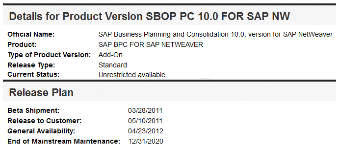 Mantenimiento y soporte estándar de SAP BPC 7.0 NW ha finalizado
