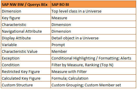 Equivalencia de términos entre SAP NW BW y SAP BO BI