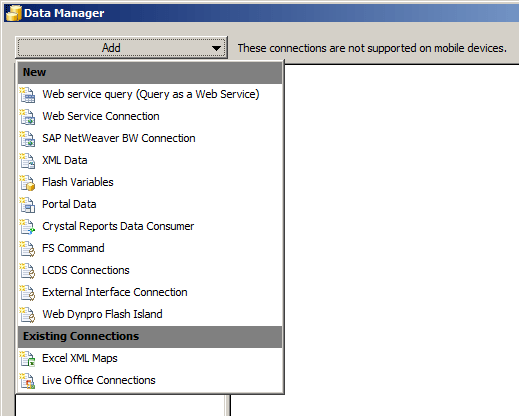 Imagen anterior Imagen siguiente Opciones de conectividad de SAP Dashboards 4.0 SP7 vía menú Data Manager