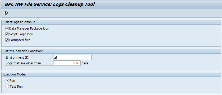 Imagen siguiente Pantalla inicial de UJF_FILE_SERVICE_CLEAN_LOGS de SAP BPC NW 10.0, utilidad para eliminar ficheros logs, temporales o dañados