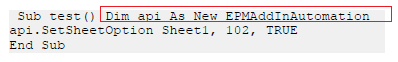 Imagen siguiente Sintaxis que se dió a conocer inicialmente para declarar variables objeto para acceder a la API del EPM Add-in