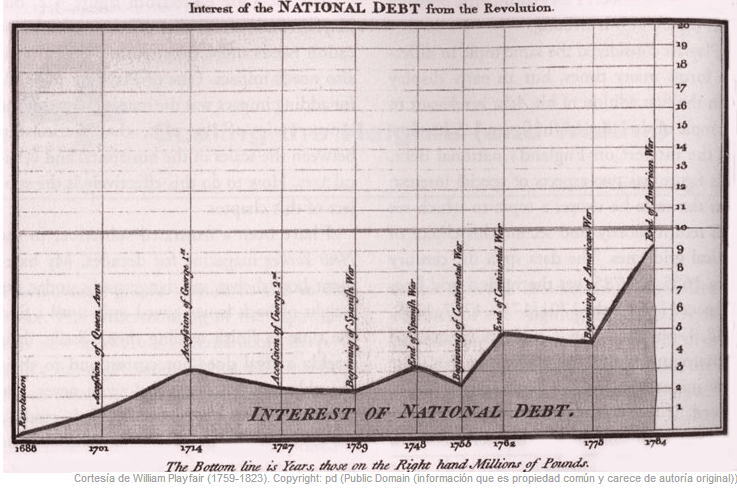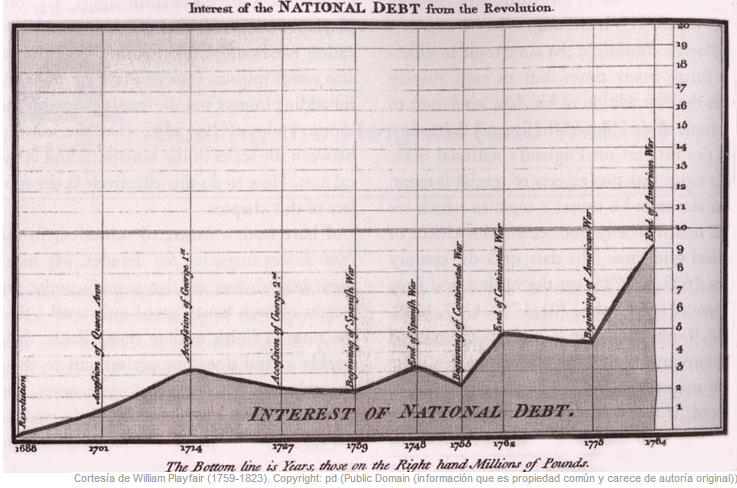 Imagen anterior Playfair incluido este gráfico en su Anuncio y Atlas Político (1786) para argumentar en contra de la política de financiación de las guerras coloniales a través de la deuda nacional de Inglaterra