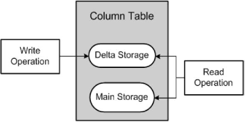 Imagen siguiente Operaciones de escritura y lectura con los Delta Storage de SAP HANA en una tabla con almacenamiento basado en columnas