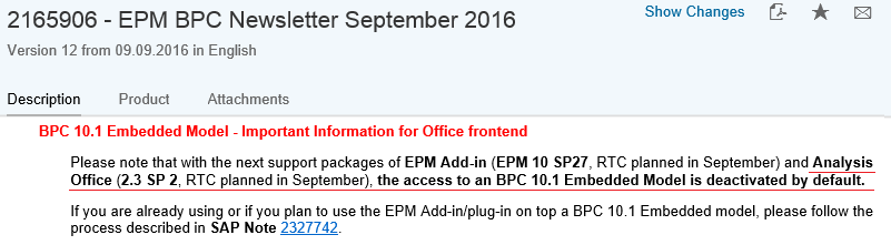 Acualización SP27 del EPM Add-In, «por defecto», con acceso desactivado a modelos embebidos de BPC 10.1