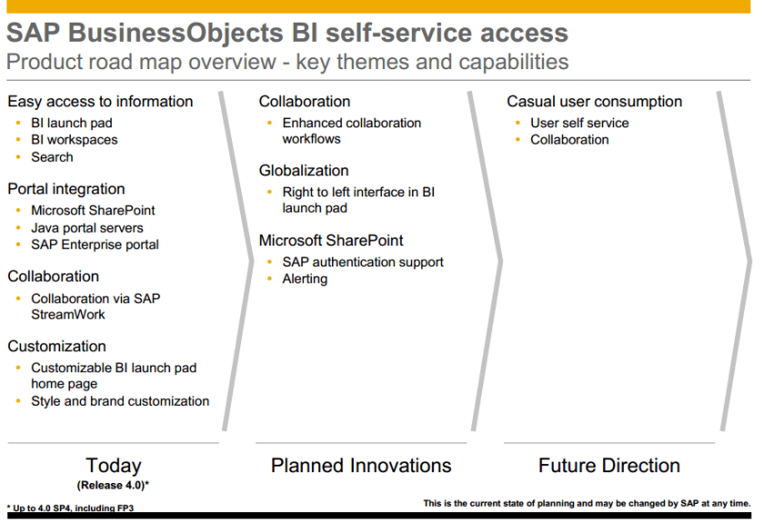 El road map del “Self-service access” de BI4, al igual que otros “mapas de ruta” es una declaración de intenciones no exenta de modificaciones, de la actualización del 9 de agosto, destacamos lo siguiente: