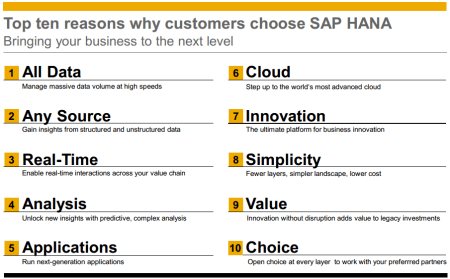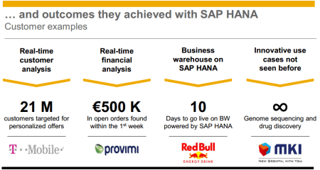 Nos quedamos como anuncios más importantes: la disponibilidad de SAP HANA 1.0 SP05 para el 30 de noviembre, la liberación o disponibilidad general de SAP Predictive Analysis y la versión de CRM sobre SAP HANA (SAP 360 Customer), la primera aplicación transaccional sobre la plataforma in-memory computing de SAP (sin considerar el componente HANABPC que requiere SAP NW BW powered by SAP HANA).